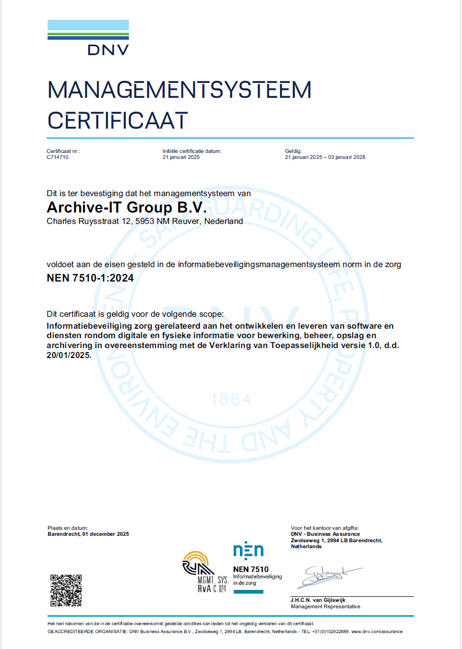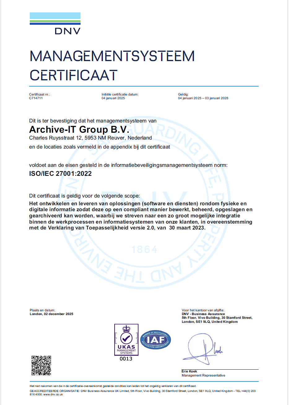 Dat Archive-IT haar processen rondom de beveiliging van zowel fysieke als digitale dossiers optimaal op orde heeft, blijkt onder andere uit de certificeringen die zijn afgegeven na onafhankelijke audits. De ISO-certificaten zijn uitgegroeid tot een onmisbaar aspect voor Archive-IT. Naast ISO 27001 bezit Archive-IT het NEN 7510 en ISO 9001 certificaat.